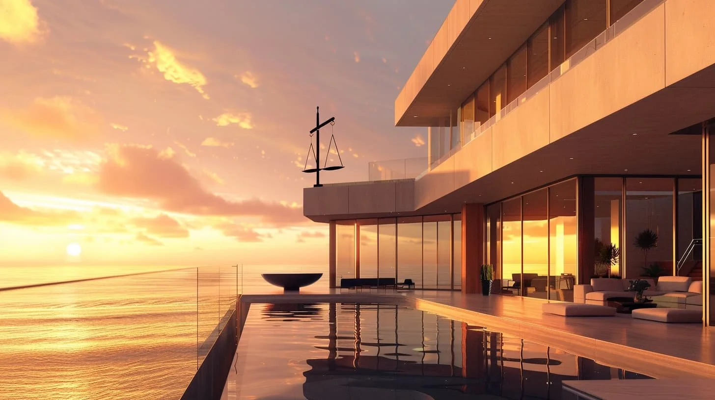 Redondo Beach luxury home at sunset with rooftop scales of justice, symbolizing fairness in divorce appraisals.